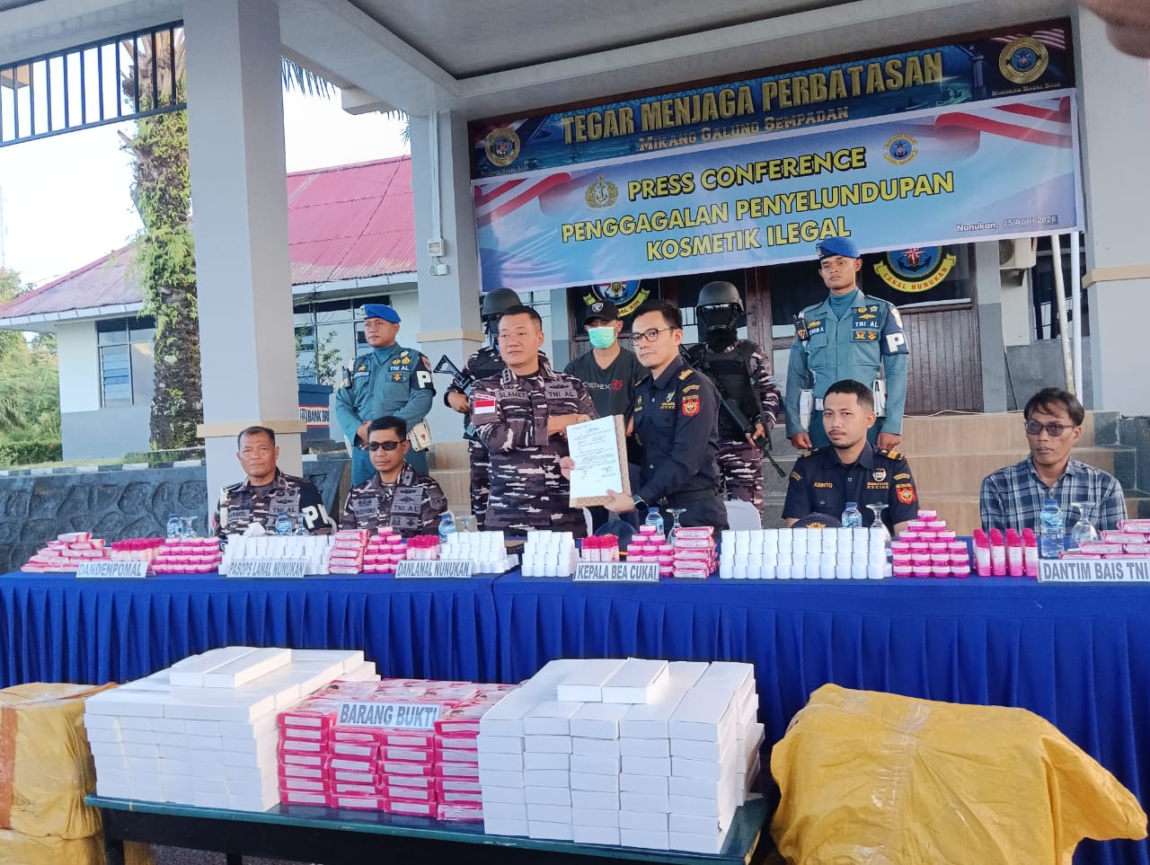 “Pada hari ini kami melaksanakan press conference terkait keberhasilan penggagalan penyelundupan kosmetik ilegal asal Tawau, Malaysia. Total barang bukti yang diamankan sebanyak 1.832 item,” ujar Slamet Ariyadi.
